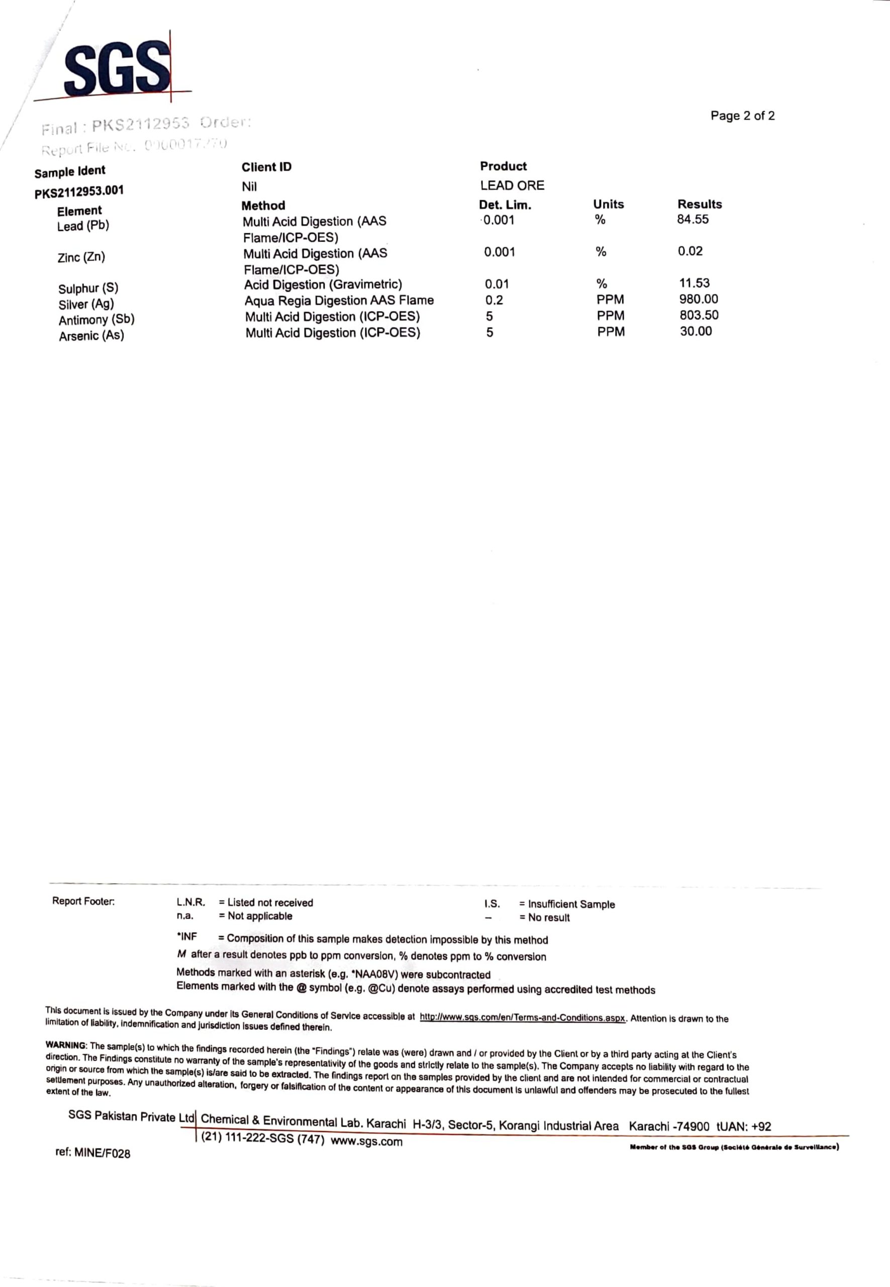 This SGS analysis confirms an exceptionally high-grade lead (Pb) ore sample from Pakistan. With 84.55% Pb, the sample falls into a premium-grade category and is further strengthened by a meaningful silver credit (980 ppm) and minor associated antimony. The chemistry indicates a highly valuable lead-rich ore suitable for premium positioning, subject to representativeness and bulk verification.